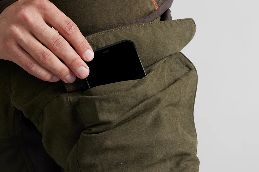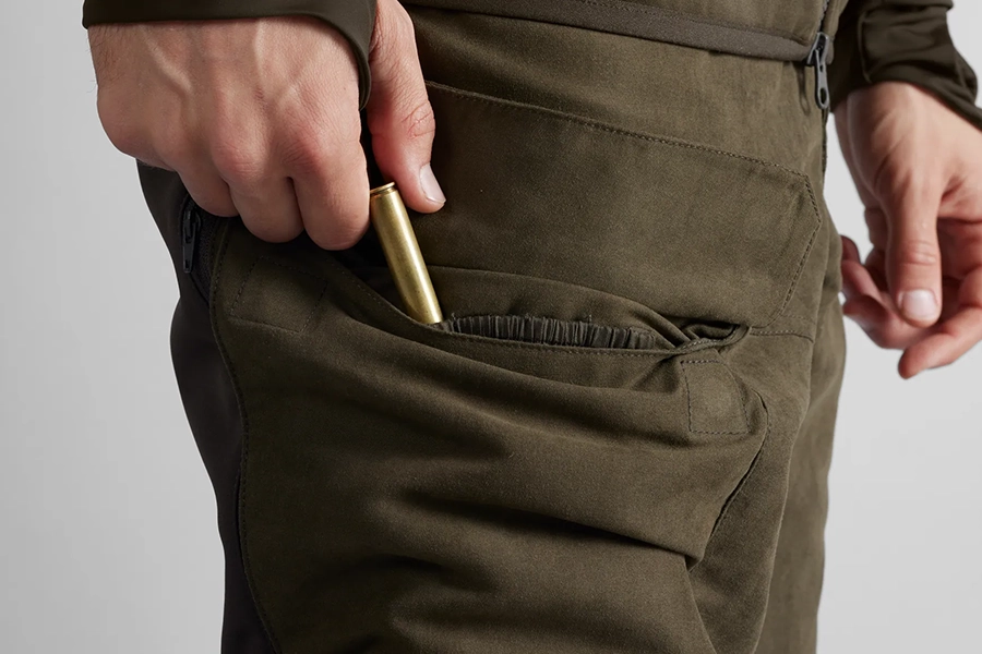 Le tasche sulle cosce sono ampie e dotate di chiusure magnetiche silenziose, con comparti interni dedicati: portacartucce nella tasca destra e tasca per telefono nella sinistra, per organizzazione e praticità sul campo.