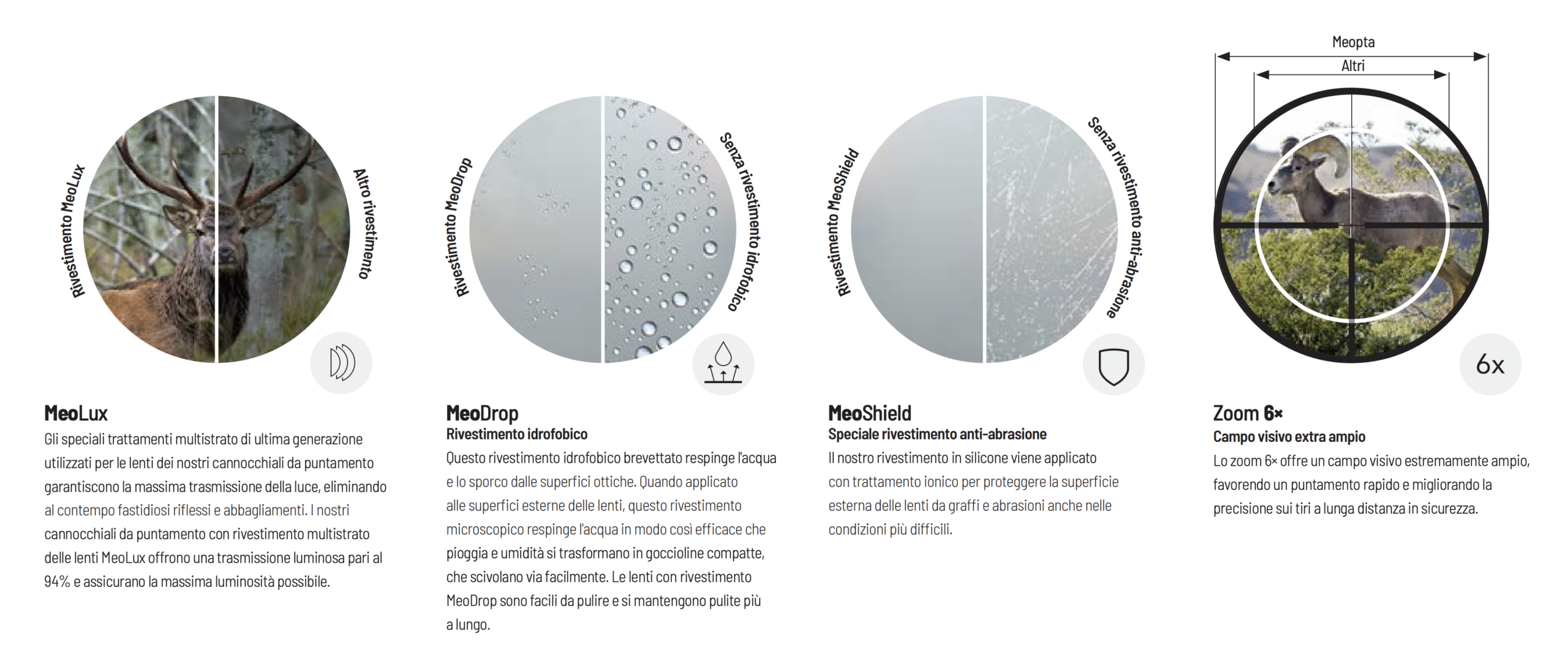 Il MeoPro R6 utilizza lenti ad alta definizione con trattamenti multistrato MeoBright, che assicurano un’eccellente trasmissione della luce, un contrasto elevato e una resa cromatica naturale. Questo si traduce in una visione chiara e dettagliata all’alba, al tramonto e in ambienti a scarsa luminosità, consentendo al tiratore di identificare il bersaglio con precisione assoluta.