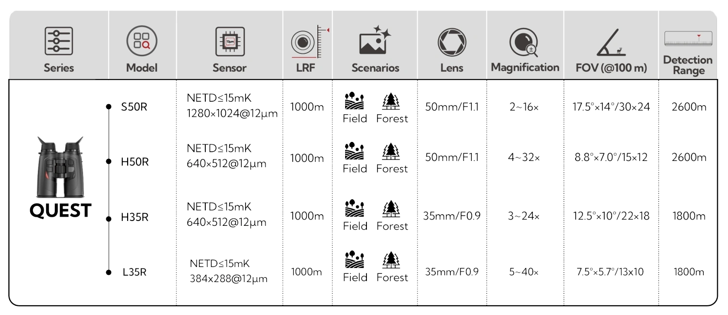 QUEST offre un’esperienza visiva straordinaria grazie al display AMOLED ad alta risoluzione e alla tecnologia di miglioramento immagini R+. Con un sensore termico performante, un rilevamento fino a 2600 m e un design ergonomico leggero e resistente (IP67), è lo strumento ideale per chi cerca precisione, comfort e affidabilità in ogni situazione outdoor.